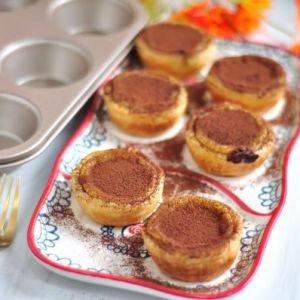将蛋挞皮塞入玛芬蛋糕模中,略微整形。将年糕揪成小块放入底部,再将巧克力切碎放入。