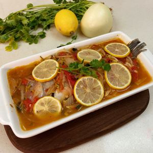 香菜切末、蒜拍扁、洋葱切丝、番茄切丁、柠檬切片留一些挤汁