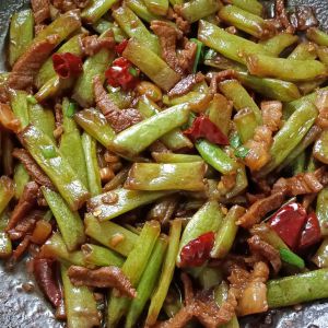 炒一会儿放入蒜头加四季豆在一起翻炒,均匀搅拌