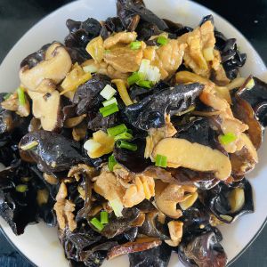 准备配菜,木耳泡发,香菇切片,肉切片,大蒜切碎,姜片切丝,葱花。