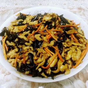 再在锅中放入食用油,用小火把碗中的葱花、姜丝、蒜末炒香。转大火依次放入肉丝、大辣椒丝、木耳丝,把碗中的调汁和水淀粉洒入锅中,不停翻炒。