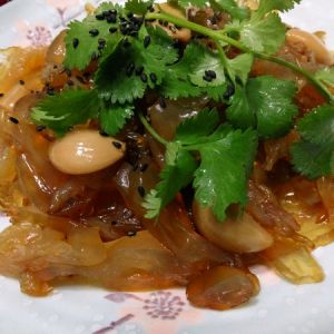 倒入适量白酒和盐在海蜇头上轻搓十分钟( 白酒既可杀菌,又可提升脆爽口感)。