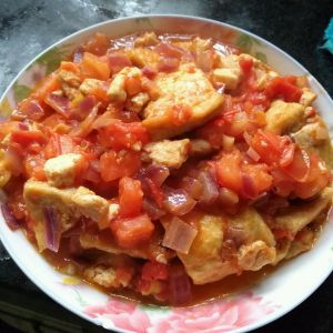 再加入煎好的豆腐炒一炒再把剩下的三分之一的番茄加进去炒一炒 炒匀就差不多不用炒很久