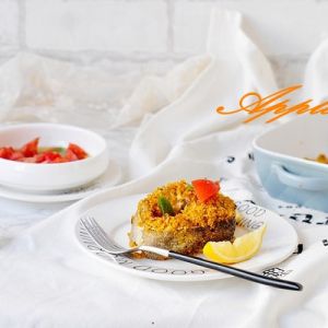 再将煎好的鱼段放入,上面再铺满面包糠。