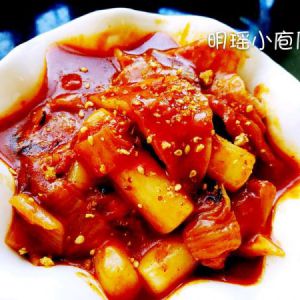 白菜炒散后倒入年糕和水,没过为宜,PS:很多大神们的方子是先要把年糕煮过一遍的,其实这样做的话年糕会更筋道一些,当然爱吃软糯的话就先煮一下吧