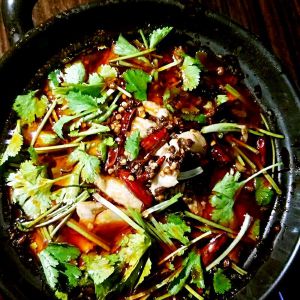 把煮好的鱼片和汤倒入铺入配菜的砂锅内,辣椒段和花椒过油锅热油浇在上面,放上香菜,麻辣美味之旅就此开始。