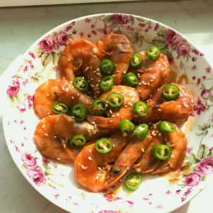 重新开小火,虾沥干料酒,依次摆入锅中,变色后翻面,煎至两面变色,用铲子轻压虾头,挤出虾油,加番茄酱,生抽,老抽,白糖,上色,加水没过虾,盖锅盖大火焖三分钟,加入水淀粉,无需加盐,等汤汁变的浓稠,出锅,码盘,浇入汤汁,洒少许芝麻,我洒了几粒杭椒点缀,吃的时候有微辣感,很不错,你也可以加葱花~