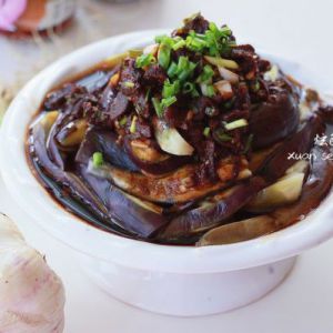 按茄子的量,加入调料。我所以说勺,就是给大家一个量化,生抽,醋,老抽的比例是1:1:0.5