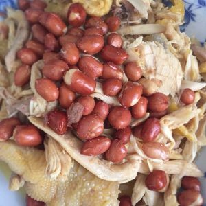 冷藏了半个小时左右,锅里倒入一点点花生油,倒入盐焗鸡翻炒一下,再倒入一点点水,焖五分钟左右,起锅装盘,最后撒上花生。