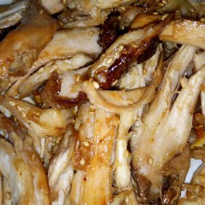 锅内留少许油,小火,倒入适量芝麻和辣椒面,翻炒几下后倒入少许酱油,白醋和白糖,酸甜程度可以品尝一下自己调节,因为烧鸡本身有咸味,所以盐是可加可不加的,最后倒入过油后的鸡肉,翻拌几下装盘。完成啦