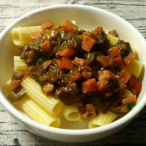 茄子酱汁浇在通心粉上,吃的时候再搅拌。so easy~麻麻再也不担心我会饿死了。