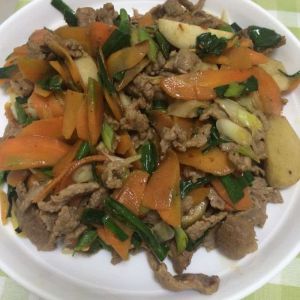 将牛肉放入翻炒片刻,加入辣椒粉(不吃辣椒的可以不加),加入少许酱油和热水,翻炒1分钟左右即可乘出。