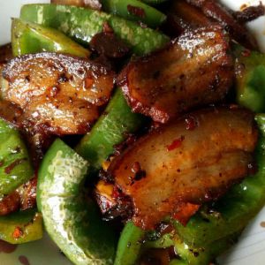锅烧热(无需加油)放入切好的肉片煸出油,放入蒜碎和两勺郫县豆瓣酱,翻炒均匀后放入切好的柿椒,加少许盐,翻炒均匀盛出即可。