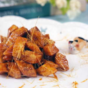 ▲等糖丝冷去了,就可以取下来放到芋头上点缀一下了。