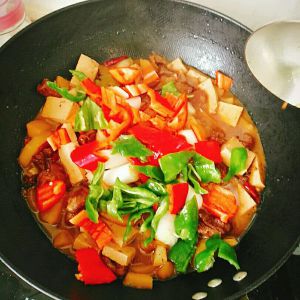 土豆炖的绵软了之后,放入大葱,大蒜,青红椒,稍稍炖下,就可以出锅啦!