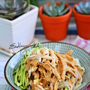 面条盛入碗中,放点调好的芝麻酱、酱汁、黄瓜丝、鸡丝、蒜末。搅拌好就开吃吧!