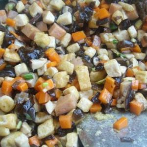 1将木耳泡发备用,切成小块。 木耳不用太多,泡发会有很多,所以少量就可以了。胡萝卜,火腿,葱,馒头,切成碎块备用