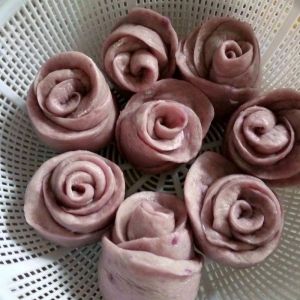 紫薯煮熟,去皮,磨成泥,放入面粉和发面剂一起和成团,发半个小时,起孔,面发好