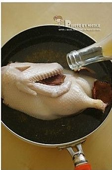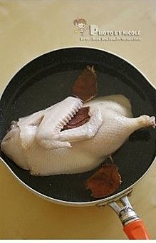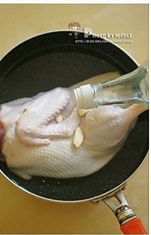锅中加入清水煮开,放入处理干净的鸭子,同时加入3瓣大蒜,加2汤匙白醋,略煮几分钟,去掉鸭肉的血沫;