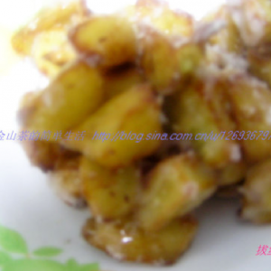 再大火烧热油,下地瓜块复炸,呈金黄色捞出,沥油待用。