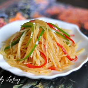 锅内放油 入土豆丝 调味 翻炒入味入红油翻炒即可