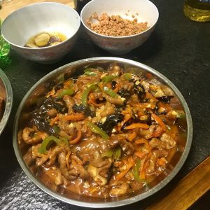 把所有的食材倒入,加一点热水,咕嘟咕嘟。