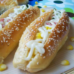 内馅做法:把黄瓜洗净、对半切开,里面的籽去掉再切丁,火腿切丁,连同玉米一起裹进面包,表面挤上色拉酱就可以了。