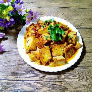 3.给锅里倒入油,油温升高后,把豆腐倒入锅里煸炒三分钟。