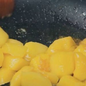 倒入炸好的苹果块,搅拌均匀,起锅放到抹过油的盘子里。