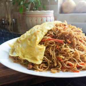煎一个蛋饼盖上去就好啦。如果不想吃肉丝的,可以直接炒鸡蛋然后放面条来炒。都可以哦。
