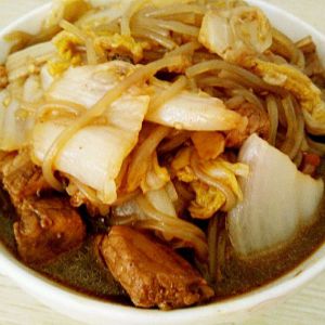 当锅里汤汁剩余不多时,往锅里放入白菜和泡软的粉条