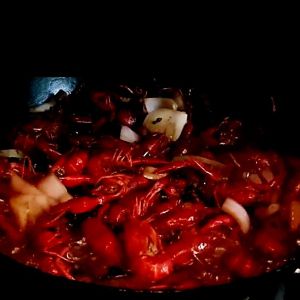 锅里来些油炒香料:放大葱姜蒜先爆香,放麻椒、花椒、干辣椒、八角、桂皮爆香后放入豆瓣酱,然后放小龙虾炒均匀