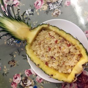 锅内放油,炒肉丁,然后放入土豆,炒熟后放虾仁,腊肠继续炒,放入调料(盐,五香粉,耗油)最后放入米饭,炒熟即可(我没放菠萝,怕孩子不喜欢,可以在这个步骤放菠萝丁)