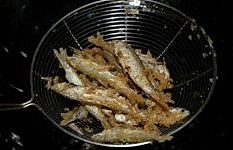 把腌好的刁子鱼沾上面糊,入油锅,油温六七热时入锅炸至金黄色后捞出沥油即可