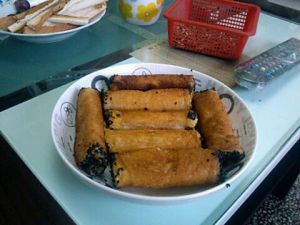 起锅热油,七八成热放入炸之金黄后,用吸油纸沾去多余油。