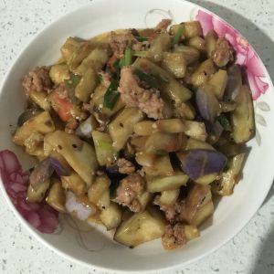锅内油热,放入姜片,葱花,炒香,赶紧放肉末翻炒,然后倒入茄子翻炒几下,放盐,老抽适量,炒熟就OK了!