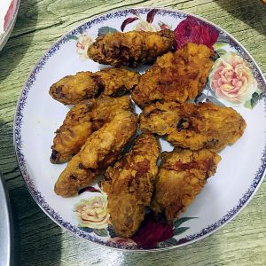 大火将锅内的油滚开后再次放入翅中,大火再炸一会,以翅中的颜色变为更深一点的金黄色为准,捞出控油即可了