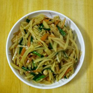 在下入土豆丝煸炒,加入盐,边炒边淋少许水,(防止糊锅)鸡精,酱油炒至断生加入胡萝卜炒到熟,最后加韭菜翻炒均匀,盛出。