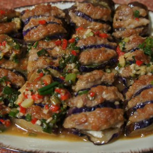 锅中放入少许油,将煎好的让茄子放入,加入适量水将茄子煮透,放入适量酱油调味,撒入切粒的青红椒及葱头粒。最后倒入开好的生粉水勾芡。