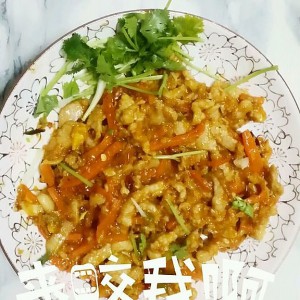 锅内放适量油,热锅冷油,葱姜蒜爆香,然后放干辣椒丝煸炒,把腌渍好的肉下锅滑炒同时放胡萝卜丝然后倒入甜辣酱,糖醋,酱油,可放少许盐,出锅。