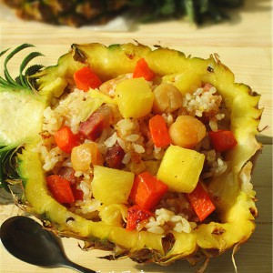 再把胡萝卜倒入煸炒均匀后再倒入菠萝煸炒出香味