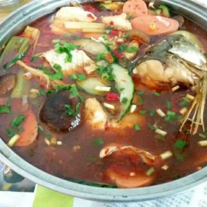 鱼要新鲜的活鱼,超市杀了拿回来最好切鱼片,可惜我家刀不锋利/::>,然后用盐,生抽,姜丝,还是最重要的淀粉腌着让它进味以及去腥味。配菜洗干净切好。锅里放油,油温高了后放花椒,辣椒,大蒜瓣,豆瓣,干辣椒,大葱,稍微放点儿老抽炒香。加水煮开,如果你切的是鱼片就先放配菜,如果切的是鱼块反之!鱼容易熟,不用煮太久,出锅装盘,撒葱花,喜欢的话,再加点儿香菜/:B-)/:B-)试试吧!记得交你的作品哈!