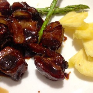 排骨油锅炒下加糖醋汁翻炒直到收汁