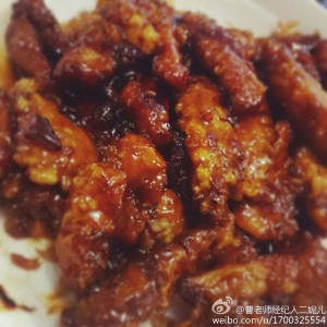 锅里放油烧热到5成,肉条裹上淀粉下锅炸到金黄。其实这样就可以开吃了的说~