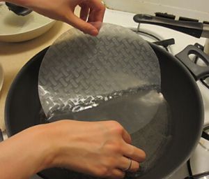 越南米皮是一种用大米的米浆做成的成透明状的米皮,干的时候像塑料纸一样,用水浸过后即可变软。可在淘宝上买到。