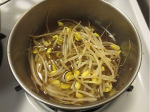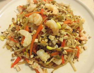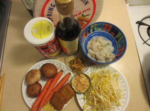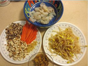 之前备好的菜需要下锅炒。顺序是:生姜-香菇-胡萝卜-香干-豆芽-虾仁-榨菜,