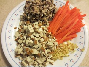 把香菇、香干、榨菜切丁;胡萝卜切成丝(有条件的最好刨成丝);生姜剁碎。