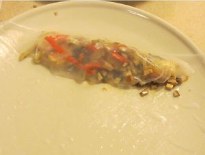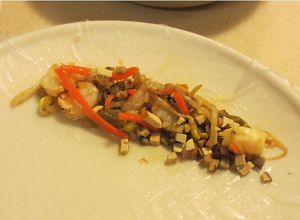 拿一个盘子,盘子上事先抹一点水,让盘子保持湿润,然后把捞出的米皮直接摊在盘子上,把炒好的馅儿铺在米皮上。