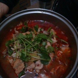 最后面就出锅装碗,把煮好的鱼片装在豆芽上面,把汤淋上,收尾把香菜放在上面,这个量煮出来有一大火锅,喜欢香菜的多放点,水煮鱼垫底的还可加入黄瓜.大白菜。没放花椒不麻,个人不喜欢没放,口味好可加点。