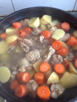 倒入适量的水 大火烧开 小火慢炖十五分钟左右 直到土豆和胡萝卜都软了就可以了